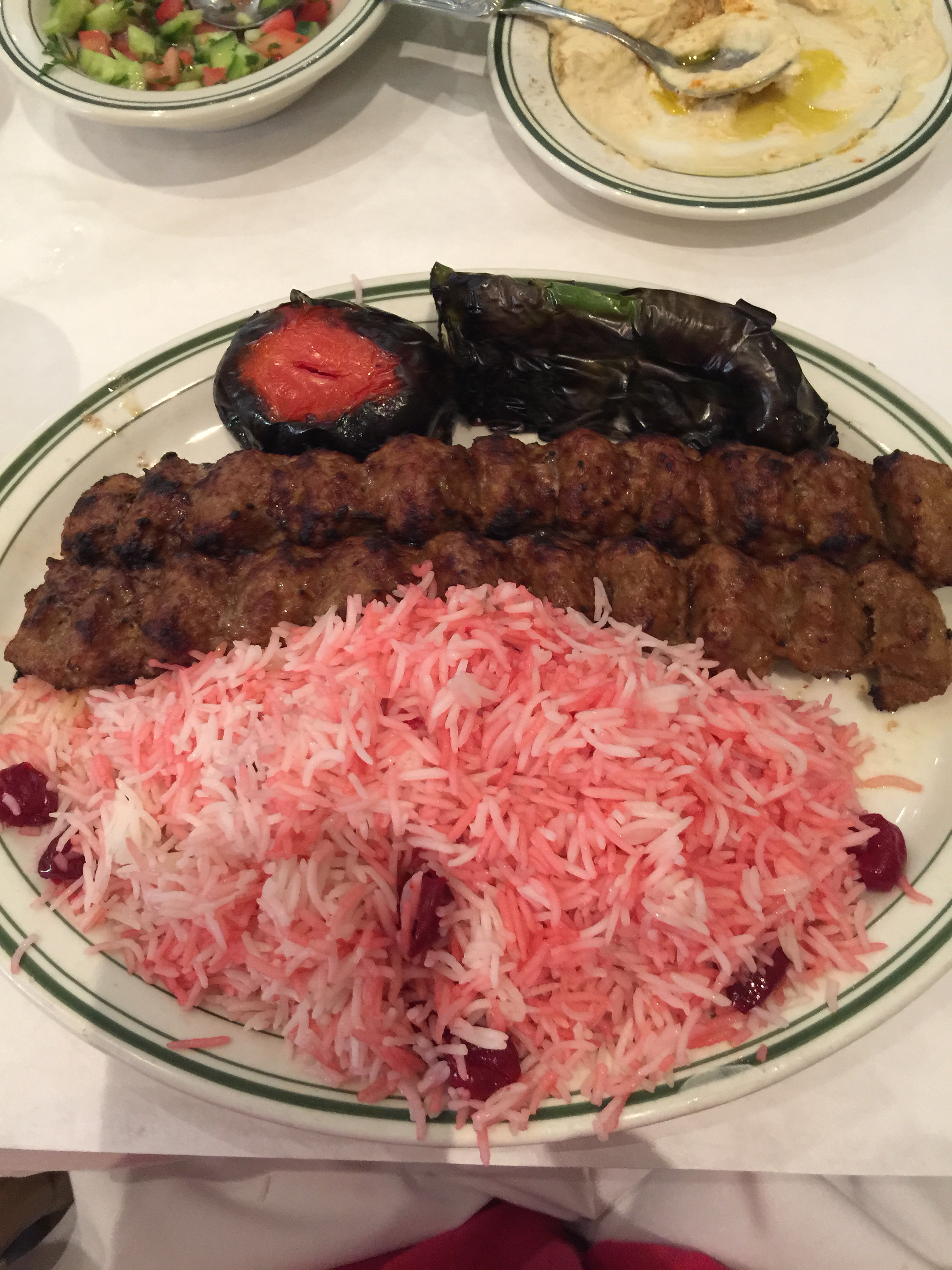 We have had a wonderful day out here is beautiful Los Angeles! After hurtling along at break-neck speed in bumper-to-bumper traffic we made it to Glendale where we were treated to a feast of a lunch at a restaurant, Rafi’s, which featured fabulous Armenian cuisine! It started with the Armenian flatbread, lavosh, eaten with madzoon (creamy yogurt) that was laced with shallots, a plate of herbs, onions and radishes, and humus and then I was served a plate of beef kabob served with cherry rice and grilled tomato and green pepper! Needless to say the greater portion was brought back to our hotel room in a box and I plan to make those leftovers my lunch for tomorrow! All of that was courtesy of a very generous cousin!